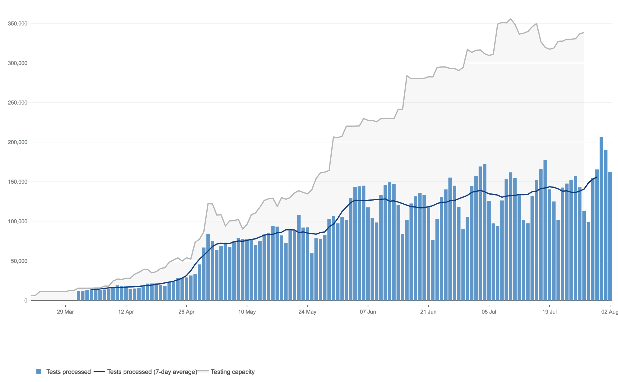The more tests you do, the more positive results you will get, so is the increase in ‘cases’ an artefact of this? The graph interestingly also shows the difference between testing capacity (grey area) and tests done (blue area). That represents public funds going to the private companies contracted to do this work, much of which is for doing very little.