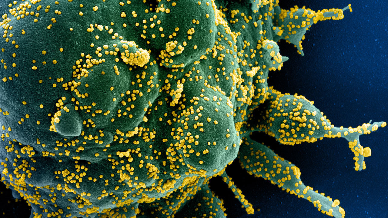 T Cells (big green cell) COVID19 (small yellow objects) (Science) |