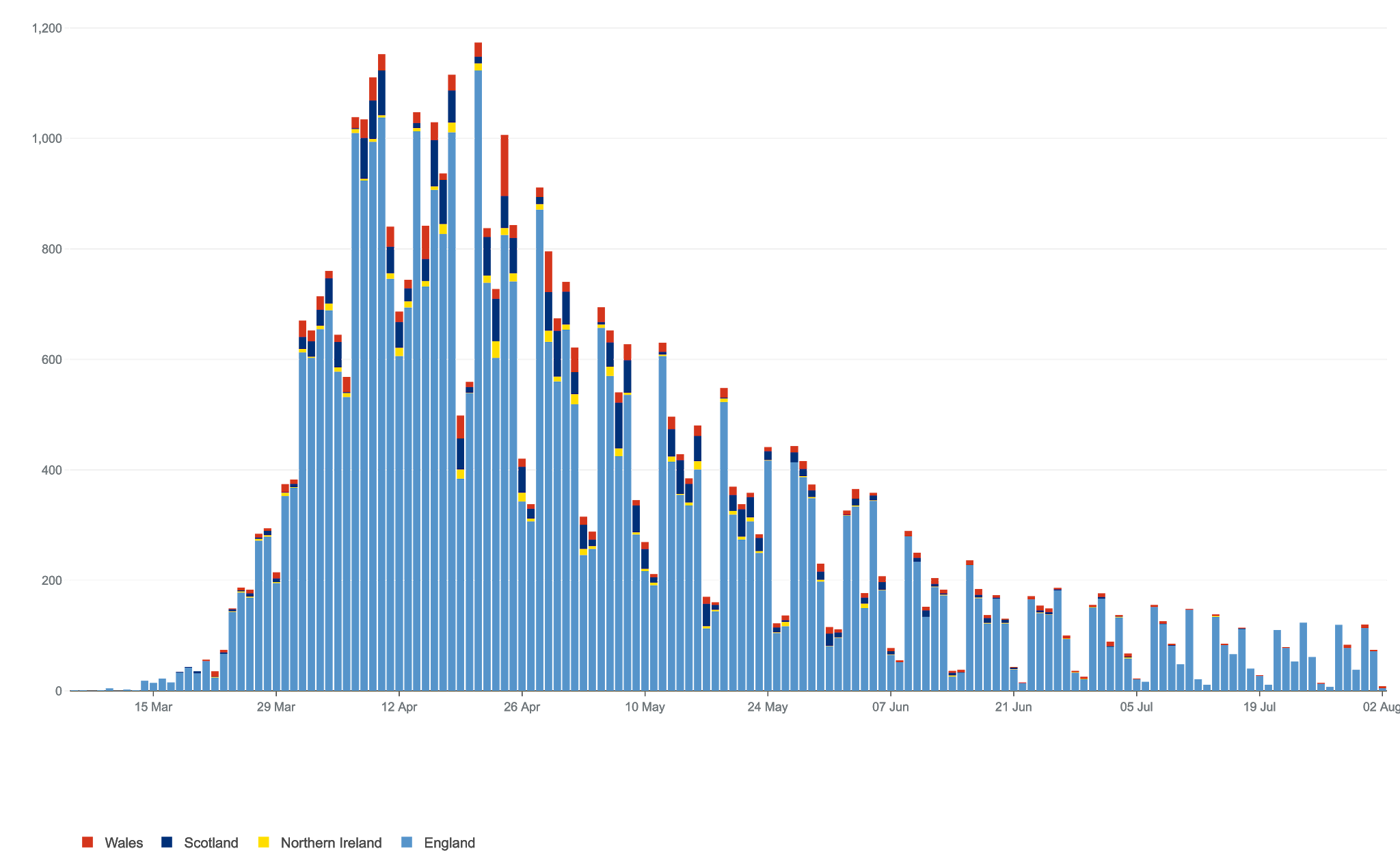 PHE are not publishing the daily deaths on their dashboard since mid July while a review takes place of what they are actually counting. (No, this is not a Monty Python sketch!) This has been prompted by potential over-counting due to people with positive tests dying of unrelated causes and still counting as a COVID19 “associated” death months later.