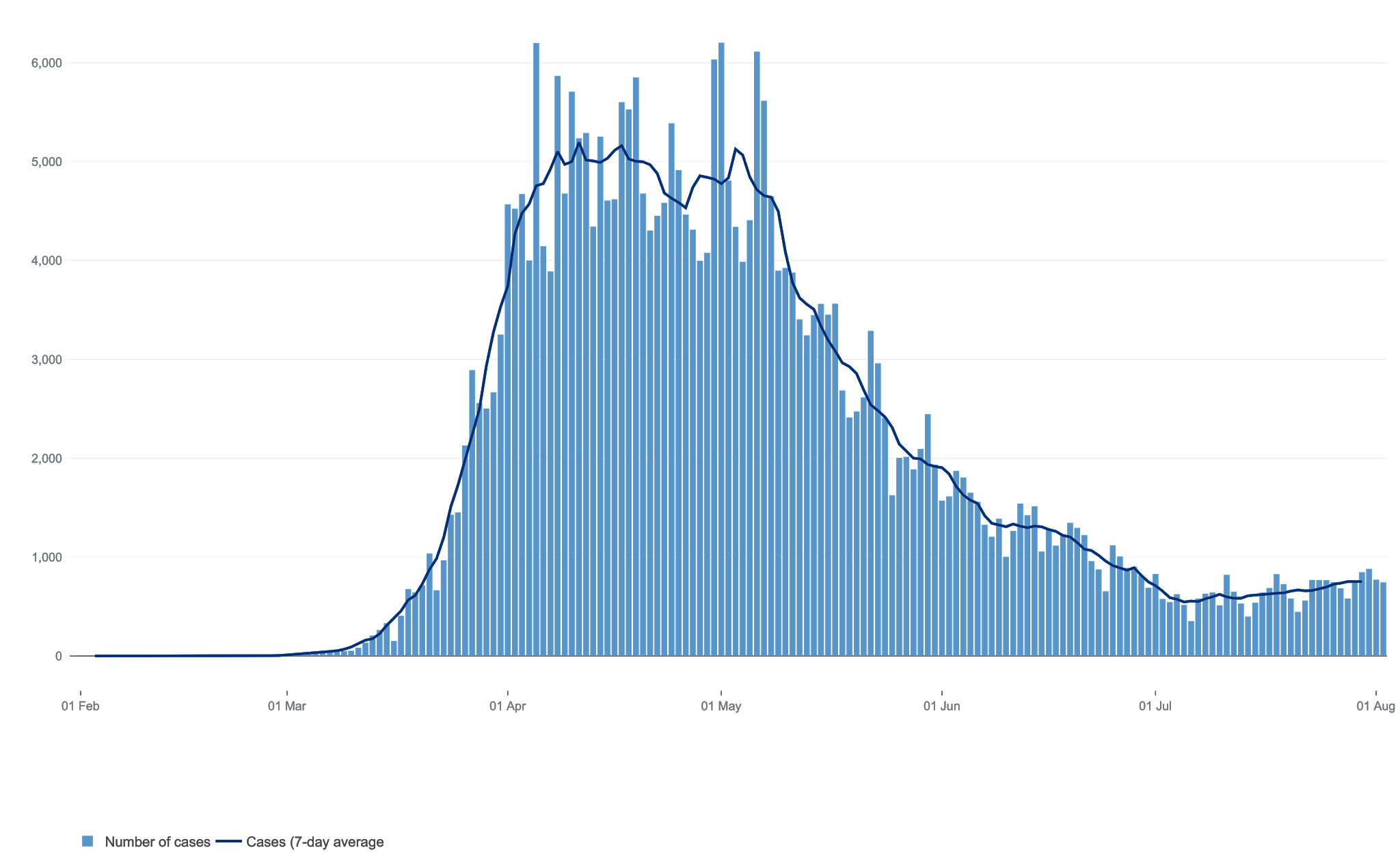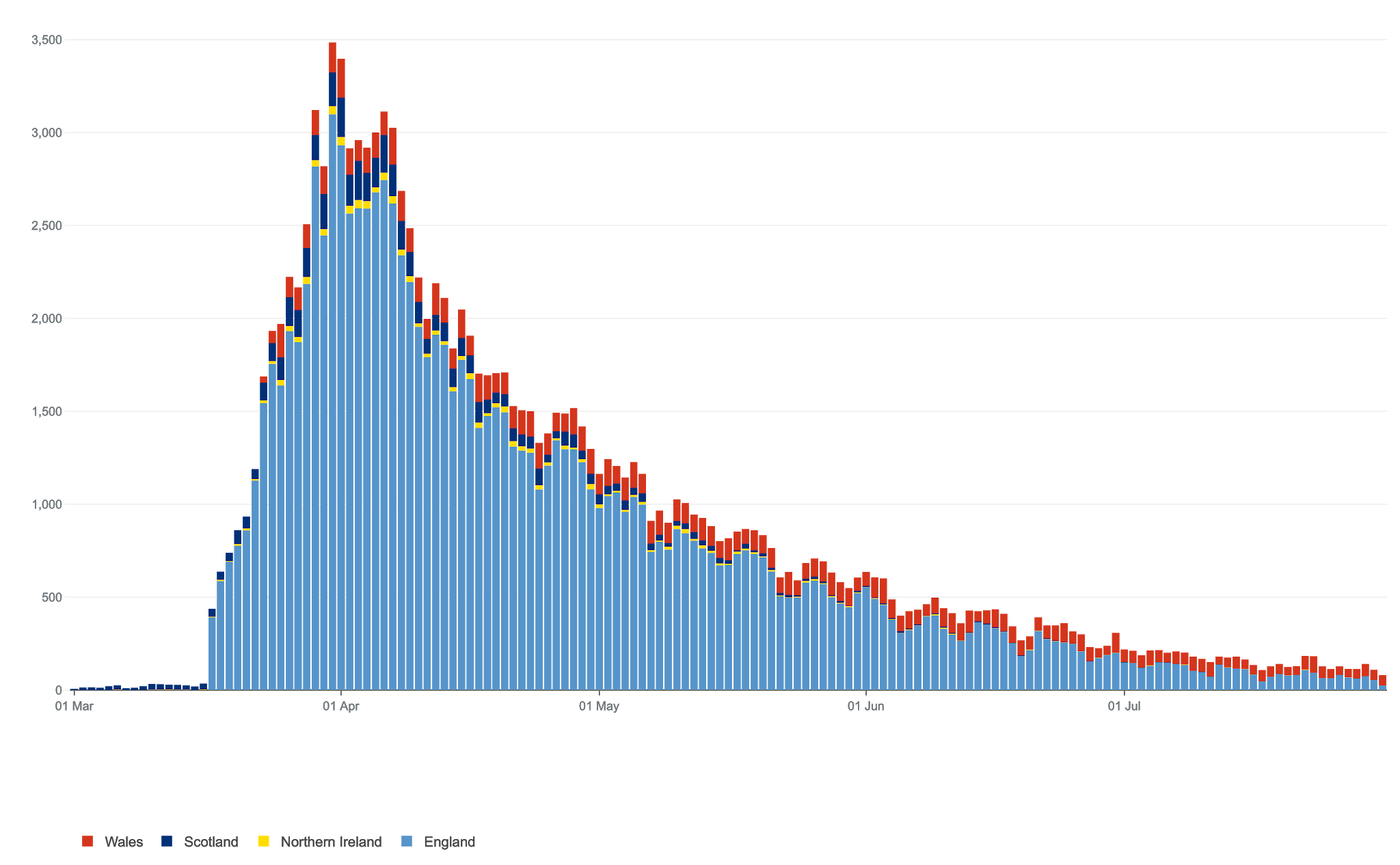 Yet any discussion of a “Second Wave” is clearly off the mark right now, it there is going to be a second wave, it will arrive in the winter. Worryingly, it is only a few weeks now until children return to school and I cant help but feel the summer has been a lost opportunity to get the pandemic infrastructure of testing, tracing, isolating and supporting right.