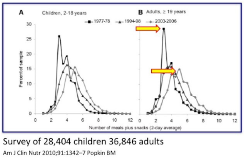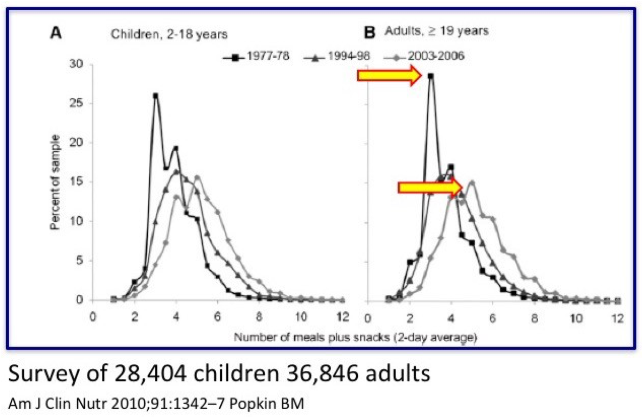From eating an average of three times a day in 1977, this 2006 study shows we now eat 5 or six times a day, and probably more since then. In between meals there are increasing numbers of snacks with most people now eating more that 6 times a day.