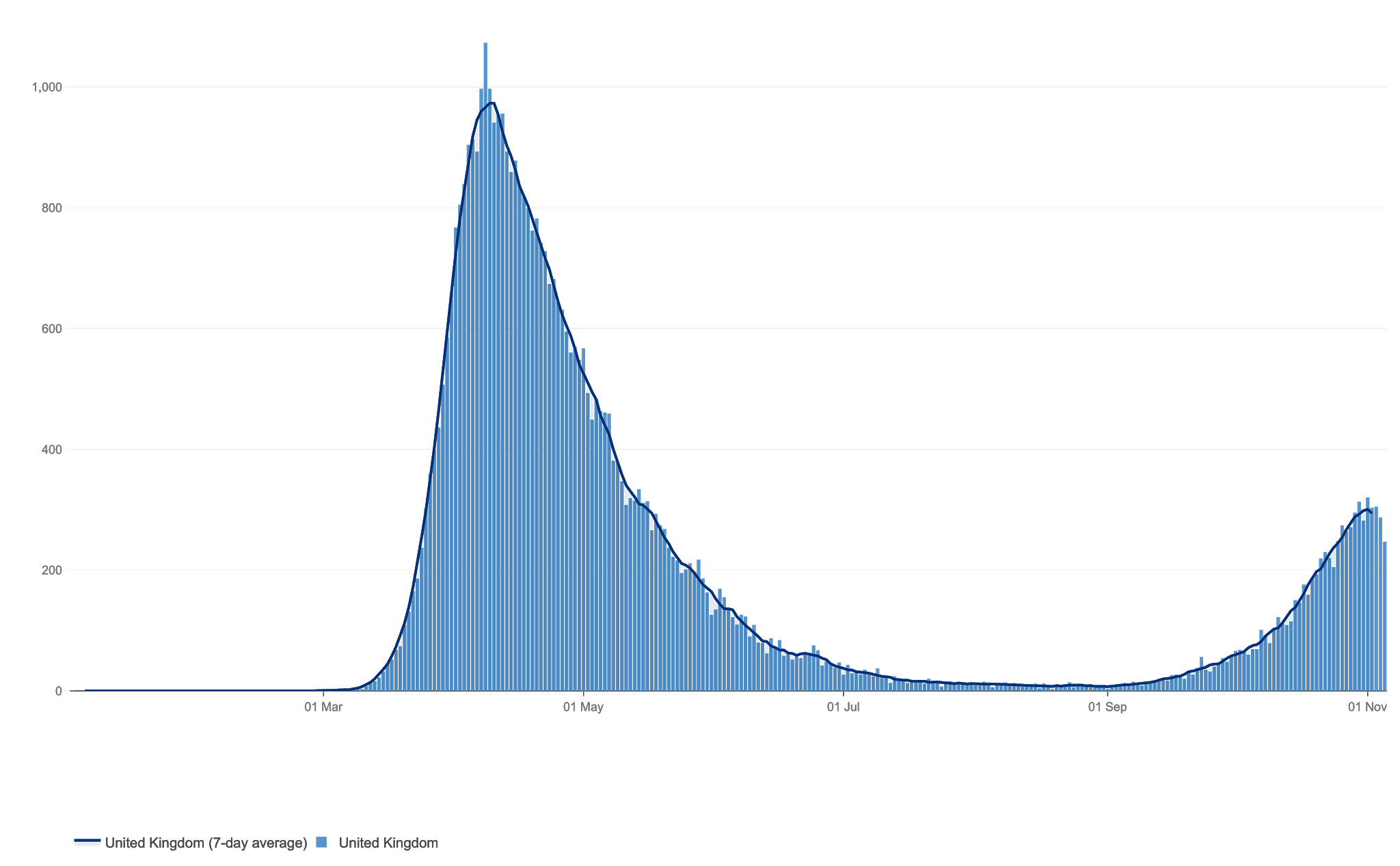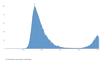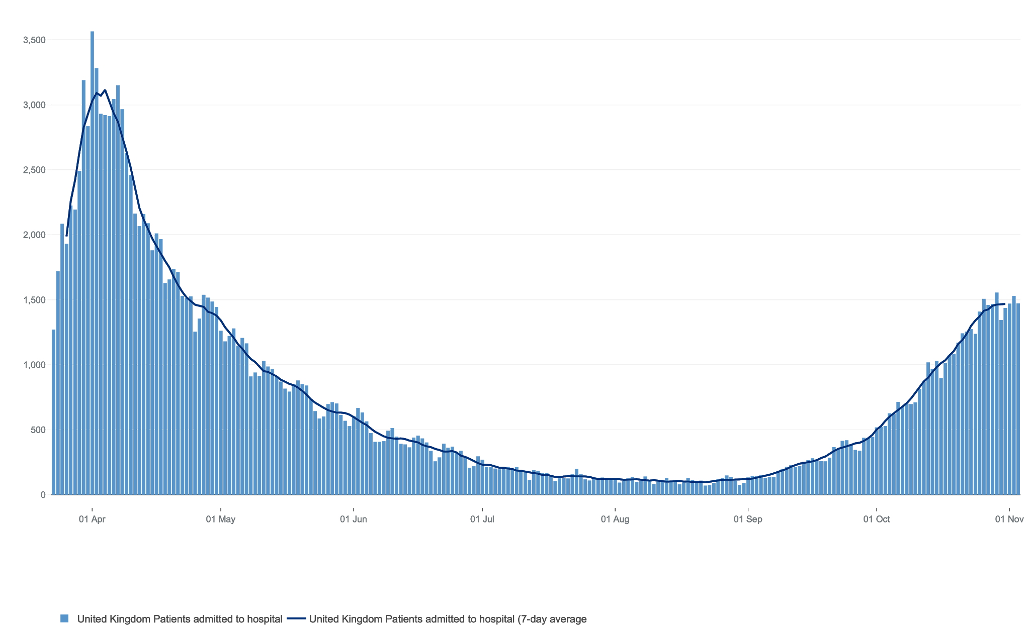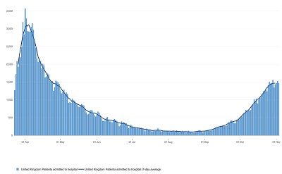 For me hospital admissions are the best way of looking at the natural history of the pandemic playing out. They are easy to count and reported daily. At the peak of the first wave, there were 20,000 people in hospital with complications of COVID19, now there are 13,000, so the second wave is of considerable size. Thankfully, there seems a definite flattening out of the curve of daily hospital admissions, which has to be seen as good news at this early phase of winter with its pressures on the NHS.